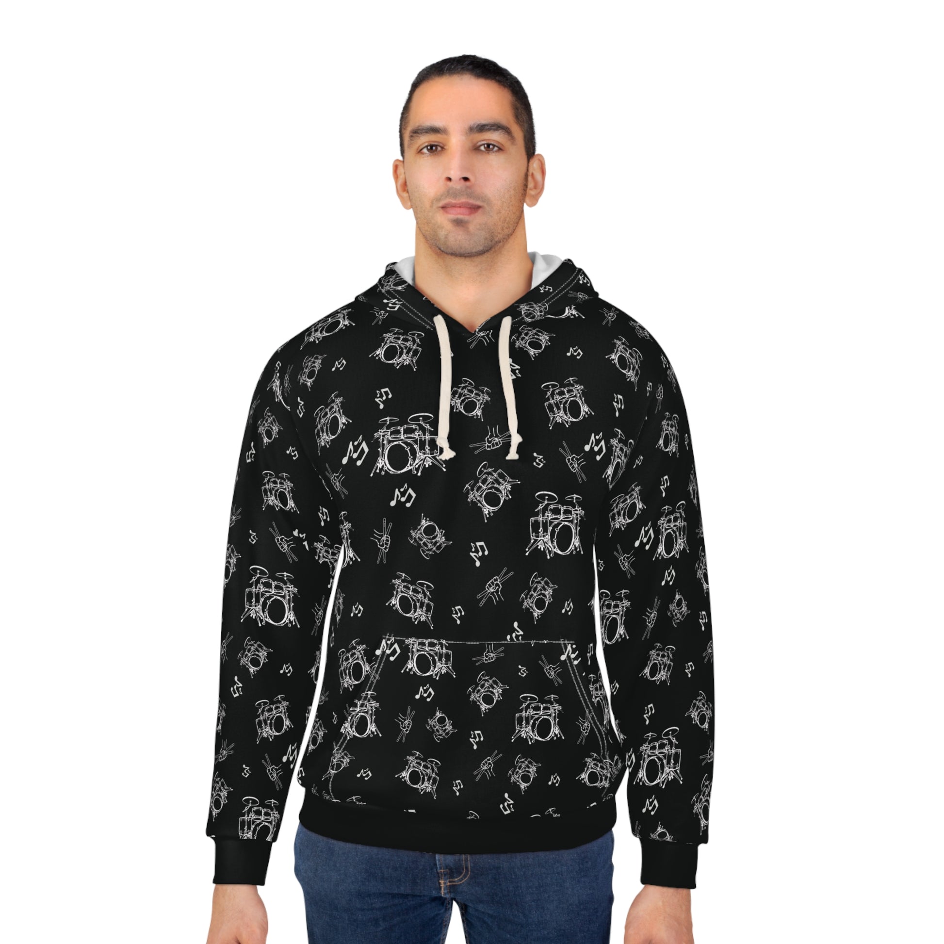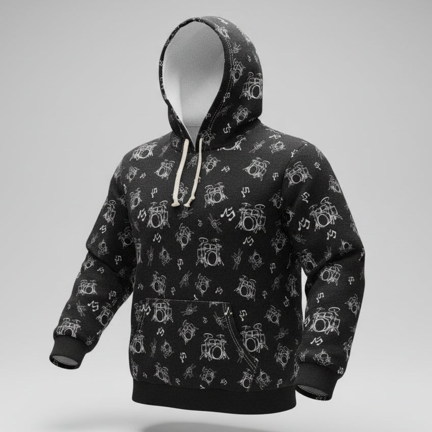 This hoodie brings a street-ready rhythm to your everyday wear. Black line-art drumset, music notes and a clenched fist clutching drumsticks flow across the fabric in an all-over pattern, like a silent jam session frozen in motion. Slip it on between rehearsals or wear it out to late-night shows — the roomy cut and kangaroo pouch cradle your hands while the adjustable hood shields you from wind or stage lights. Lightweight but sturdy polyester keeps the print vivid and the silhouette sharp after many washes. It’s clothing that looks like your life: loud, relentless, and unapologetically musical.